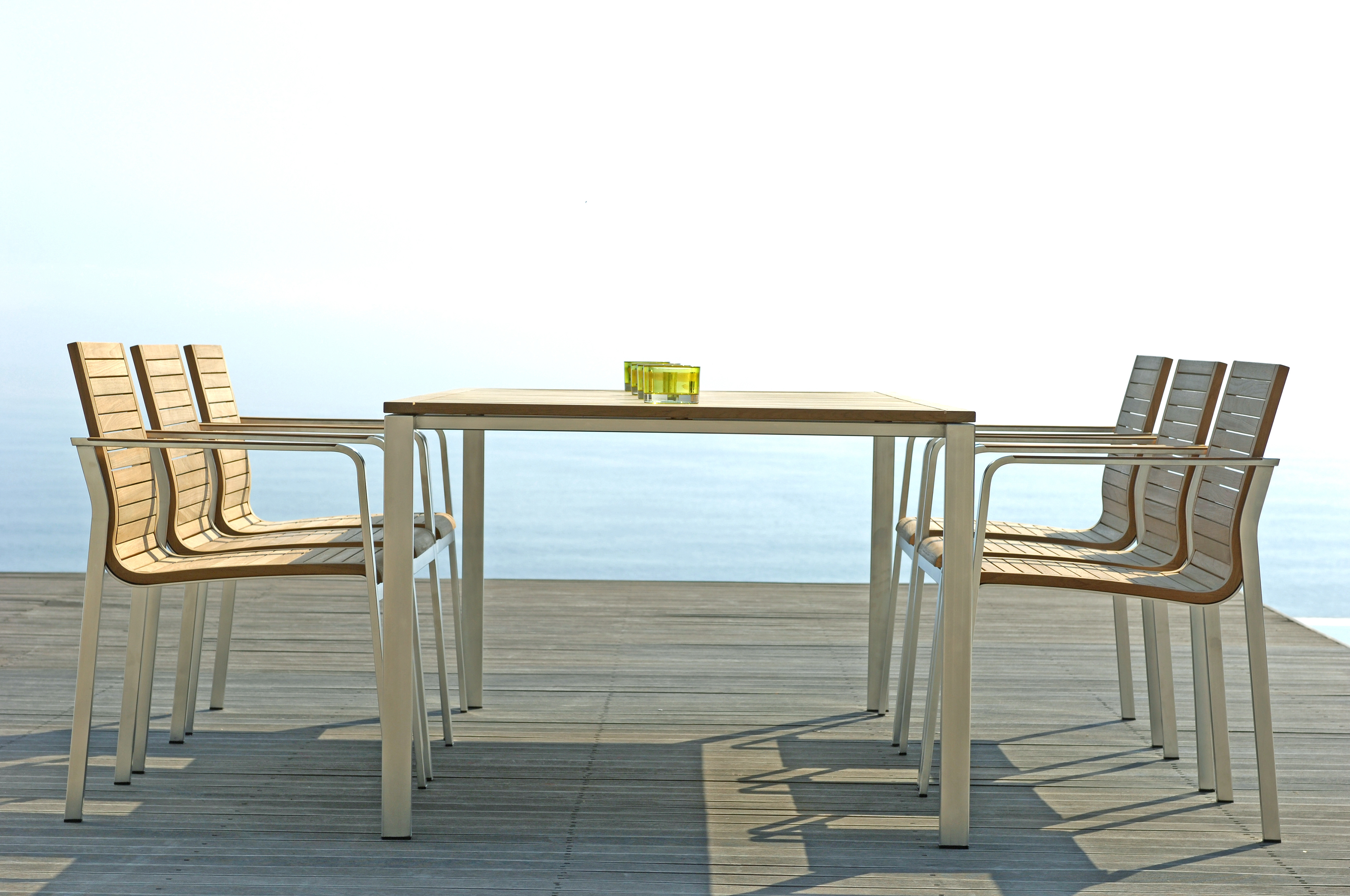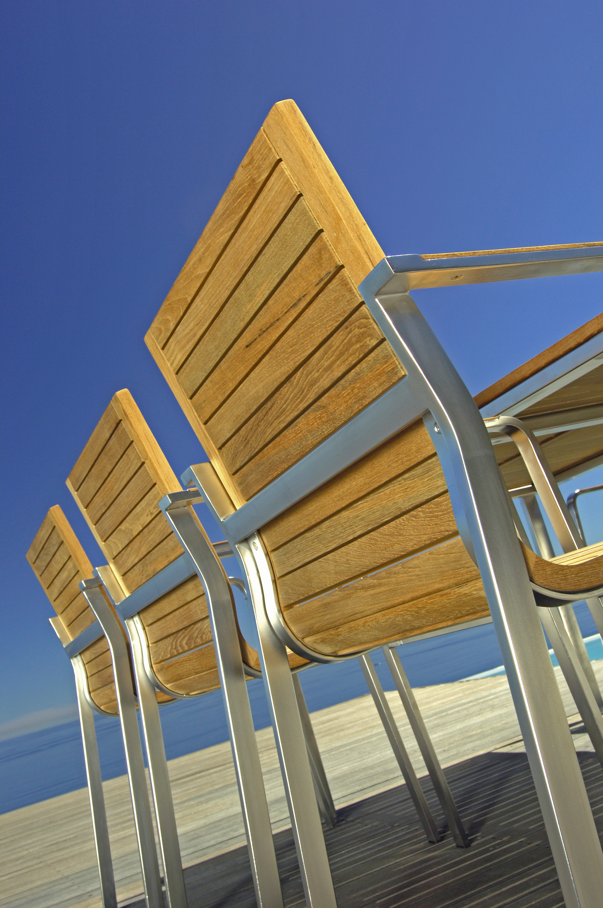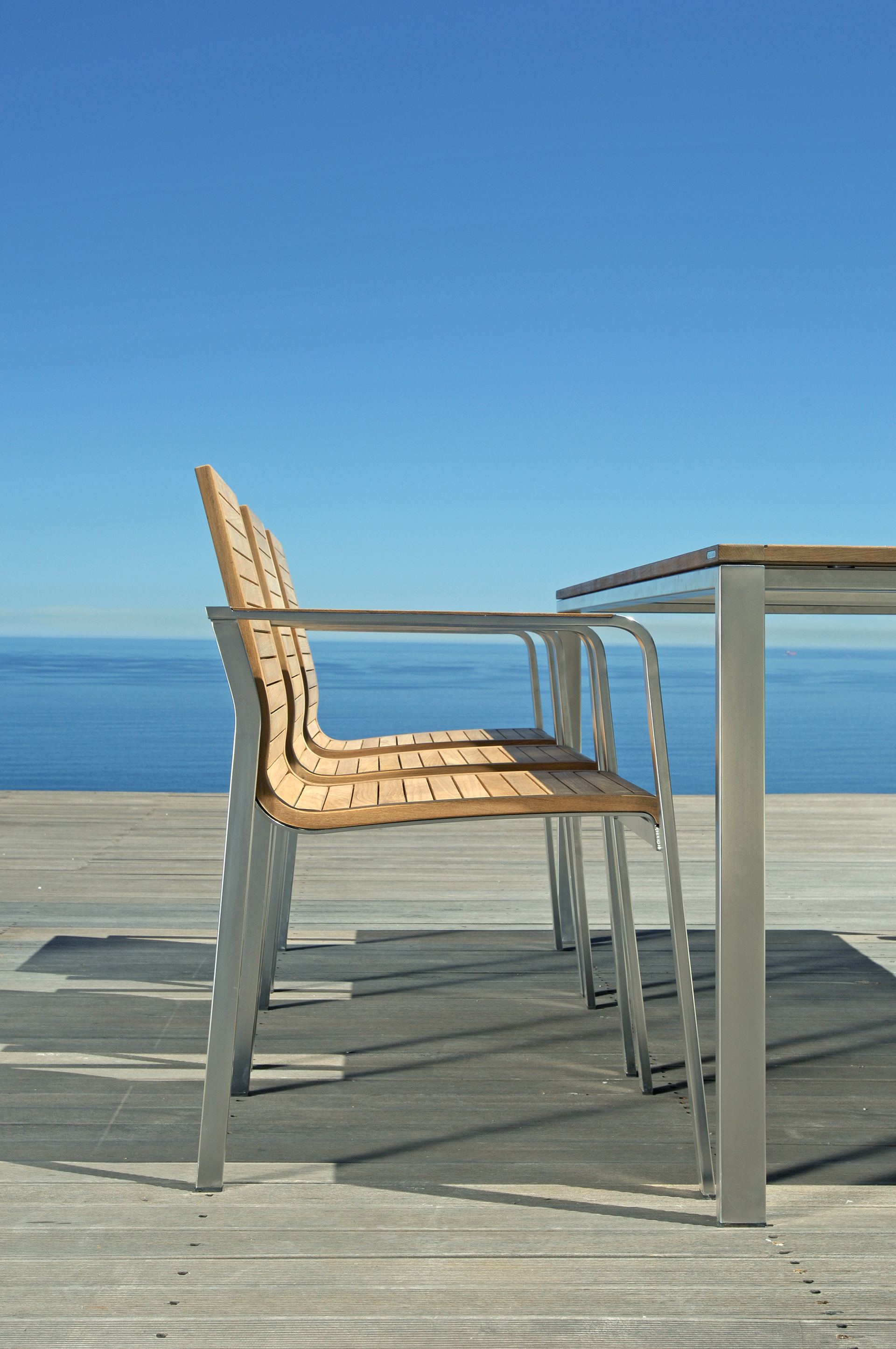 Milano: The teak seat is built into an elegant stainless steel frame. The inlaid armrest that rounds off the front gives the frame its essential elegance. Flowing lines and interplay of the materials provide innovation in this traditional market.